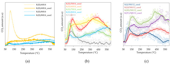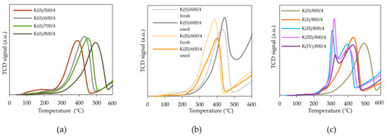 TPD-CO2 measurements were performed with the aim to find differences in basicity of the prepared catalysts. Since the catalytic activity achieved at a steady state is closer to the state of the used sample (sample after catalytic reaction) than to the sample in the fresh state, the amount and type of basic sites were mainly studied on the used samples. The comparison of the TPD-CO2 profile of fresh and used catalysts is shown in Figure 5a. The effect of calcination temperature and potassium content on the amount of basic sites is shown in Figure 5b,c.