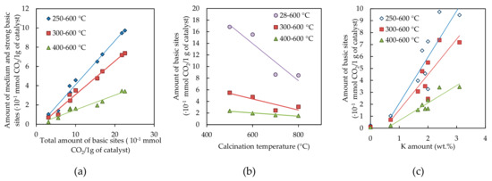 TPD CO2 results: (a) Dependence of the amount of medium and strong basic sites on the total amount of basic sites in temperature range of 0–600 °C, (b) dependence of the amount of basic sites on the calcination temperature and (c) dependence of the amount of basic sites on the potassium amount. Numbers in legend mean temperature region from which the amount of sites was calculated.