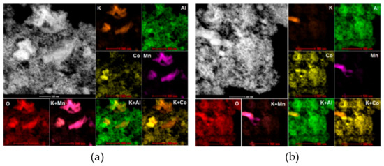 Scanning transmission microscopy using energy-dispersive X-Ray (EDS) analysis was used for 2D atomic resolution chemical mapping of selected samples. Figure 7 shows results of scanning-transmission electron microscopy (STEM) combined with energy-dispersive X-Ray (EDS) analysis for the K(II)600/4 fresh (a) and K(II)/600/4_used (b) samples. It is obvious that independently of the catalyst state, K is distributed non-homogenously and correlates with the presence of Mn, while the dispersion of cobalt and aluminum is different and more uniform. This indicates that potassium is preferentially bonded to manganese. However, the lack of identified potassium phases in TEM images may suggest that potassium is mainly present in amorphous form (potassium oxide) and/or is non-homogeneously distributed over the surface. This finding correlates with XRD results, where the only potassium containing phase was the K–Mn–O phase (not K–Co–O phase) of the amorphous character, present only in low amounts and thus difficult to detect by XRD.
