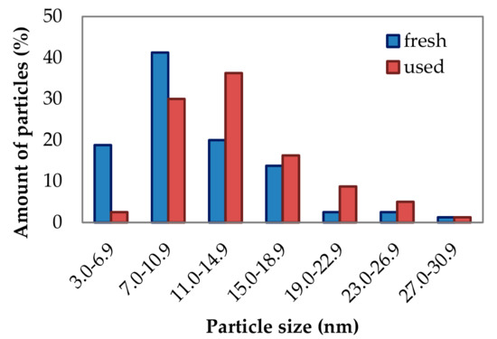 Particle size measurements of fresh and used samples (Figure 8) showed that after the catalytic reaction, the particles get larger, which is consistent with the results of XRD measurements.