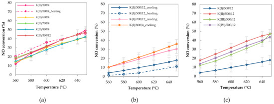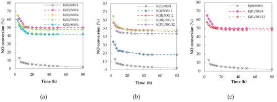 For two selected samples (K(II)/500/4, K(II)/600/4), the catalytic activity measurement was performed not only by the procedure given above but it was also adjusted as follows: After catalyst activation (heating in N2, then 1 h in N2 at 650 °C), the NO catalytic decomposition at 500 °C was measured until reaching stable performance. After that the temperature was raised to 560 °C and the measurement was performed until reaching stable performance. The same step was repeated for 600 and 650 °C. For the rest of the samples calcined at 500 or 600 °C measured by the described typical procedure, it is necessary to keep in mind that they were actually re-calcined to 650 °C during the activation and measurement of NO catalytic decomposition at 650 °C.