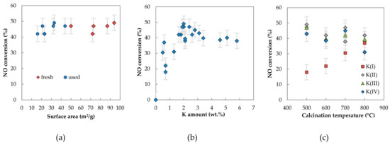 The calcination temperature affects the specific surface area, pore size, reducibility, basicity, the alkali metal volatilization process, the amount of residual potassium (after volatilization) and phase composition of the catalyst. XRD measurements showed that the presence of alkali metal influenced the position of atoms in the spinel unit cell as well as the shape and size of the unit cell. The calcination time affects the specific surface area, amount of residual potassium and catalyst crystallinity. The type of the potassium-containing phase is temperature dependent; however, if a sufficient amount of potassium promoter is present at the surface, the surface state of K does not influence NO conversion. The best catalytic performance was achieved for catalysts containing more than 1 wt.% of K. The calcination temperatures of 700 and 800 °C were found to be the best for direct NO decomposition regarding achieved activity as well as potassium promoter stability.