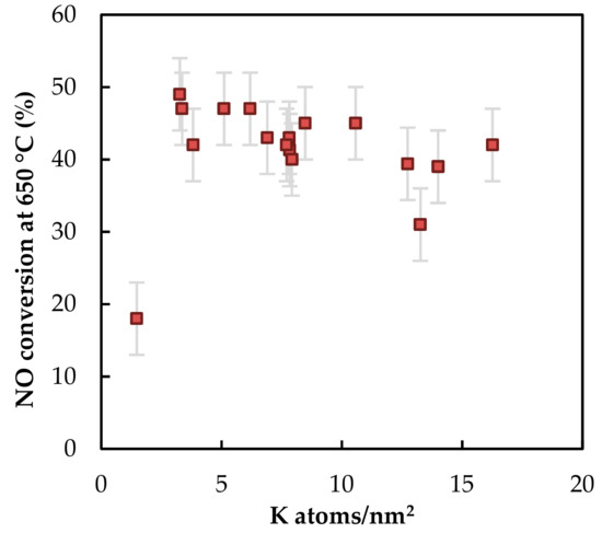 - Pacultová, K.; Draštíková, V.; Chromčáková, Ž.; Bílková, T.; Kutláková, K.M.; Kotarba, A.; Obalová, L. On the stability of alkali metal promoters in Co mixed oxides during direct NO catalytic decomposition. Mol. Catal. 2017, 428, 33–40. [Google Scholar] [CrossRef]