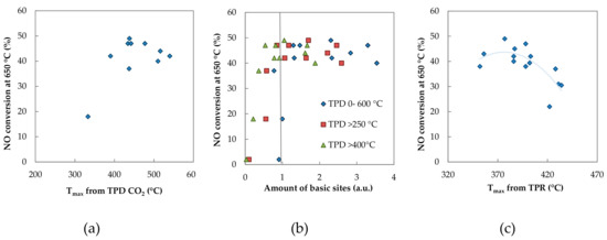 Catalyst basicity is an important factor influencing chemical reactivity towards NO because of the acidic nature of the NO molecule [48]. In the temperature programmed desorption of CO2 (TPD-CO2) profile, several types of basic sites in mixed oxides were reported. Weak basic sites represent –OH groups on the surface of the catalyst, medium sites consist of oxygen in Me2+−O2−, Me3+−O2− pairs and strong basic sites correspond to the isolated O2− anions [49]. However, strict separation of individual peaks above 140 °C reflecting the presence of medium (140–220 °C) or strong (>270 °C) basic sites is not common in the literature.