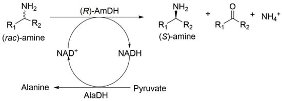 A surge of interest has occurred in recent years in the use of superior biocatalytic alternatives to the chemical syntheses of chiral amines [13,14]. Enzymes such as transaminases [15], imine reductases [16], amine oxidases [17], P450 monooxygenases [18], lipases [19], and berberine bridge enzyme [20] have been successfully employed for chiral amines synthesis. More recently, amine dehydrogenases (AmDHs)—catalyzing the reductive amination of ketones using ammonia and generating only water as byproduct—have been discovered [21]. Owing to the high enantioselectivity and atom efficiency, AmDH-mediated synthesis is very attractive and a potential biocatalytic approach for the synthesis of chiral amines. However, AmDHs are not ubiquitously present in nature. Nevertheless, Itoh et al. first reported the presence of AmDH in Streptomyces virginiae IFO 12827 [22]. However, this enzyme was unexplored for another decade owing to its poor enantioselectivity and the unavailability of the genetic information. Subsequently, thermostable AmDH from Petrotoga mobiliz DSM 10674 was discovered [23]. Furthermore, the group of Bommarius at Georgia Institute of Technology, U.S.A. generated the first engineered AmDH using Leucine dehydrogenase (LeuDH) from Bacillus stearothermophilus [21]. Bommarius’ group developed second AmDH based on phenylalanine dehydrogenase (PheDH) from Bacillus badius as a scaffold [24]. Furthermore, the Bommarius group generated a chimeric AmDH by domain shuffling of LeuDH and PheDH parental scaffolds. This chimeric AmDH substantially improved the substrate scope of the previously generated AmDHs and converted sterically hindered substrates to their corresponding enantiopure (R)-amine products [25]. Using a similar engineering strategy to that used previously, more AmDHs were generated from L-amino acid dehydrogenase scaffolds from Rhodococcus sp. M4, Exiguobacterium sibiricum, Caldalkalibacillus thermarum and Lysinibacillus fusiformis [26,27,28,29]. These engineered AmDHs have been successfully employed in tandem with other enzymes to obtain various enantiopure compounds. For instance, AmDHs in combination with alcohol dehydrogenases have been used in a redox-neutral two-enzyme cascade for the asymmetric transformation of racemic secondary alcohols into chiral amines [27,30].