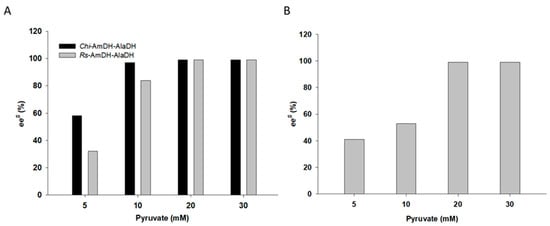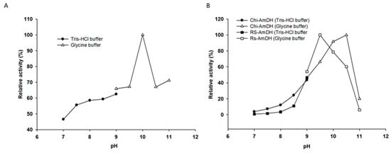 Since the stability and activity of the biocatalysts are dependent on the pH, they can critically affect the overall outcome of the biocatalytic reaction. Especially for reactions catalyzed by the enzymatic cascades, wherein each constituent enzyme exhibits different optimum pH, the pH of the reaction should be carefully determined so that activity of the enzymes is not severely compromised [10,32,33]. Thus, the effect of varying pH on the activities of AmDHs and AlaDH was evaluated (Figure 3). In the case of AlaDH, marginal improvement in activity was observed with the increase in pH of Tris buffer (100 mM) from pH 7.0 to 9.0. The optimum activity of AlaDH was observed at pH 10.0 (Glycine buffer, 100 mM). For AmDHs, steep increase in activity was observed with the increase in pH beyond 9.0. The maximum activity for Chi-AmDH and Rs-AmDH was observed at pH 10.5 and 9.5, respectively. Thus, the kinetic resolution using Chi-AmDH-AlaDH and Rs-AmDH-AlaDH was carried at pH 10.0 and 9.5, respectively.