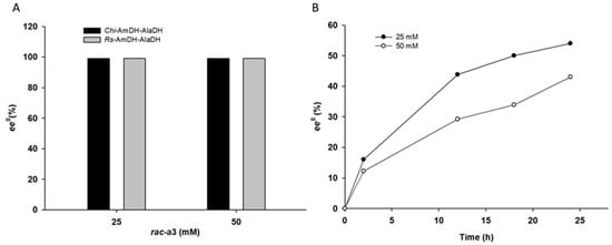(A) Kinetic resolution of increased concentration of rac-a3 and (B) Time profile of the kinetic resolution of rac-a7 (25 and 50 mM) using AmDH-AlaDH purified enzyme system. Reaction conditions: 25/50 mM rac-a7 (or rac-a3), 1 mM NAD+, 1 mg/mL AmDH, 1 mg/mL AlaDH, 50/100 mM Pyruvate, 100 mM Glycine buffer (pH 9.5/10.0), 37 °C, 200 rpm for 24 h.