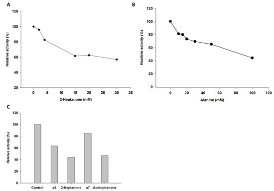 Our previous studies for the kinetic resolution of racemic amines using Chi-AmDH-NADH oxidase system also reported the strong inhibition of the enzymes by racemic amine substrates and/or corresponding ketones [32]. We herein studied the product inhibition of Rs-AmDH in the presence of varying concentration of 2-heptanone ranging from 2–30 mM (Figure 6A). As alanine is also produced in the AmDH-AlaDH catalyzed reactions, the effect of varying concentration of alanine (10–100 mM) on the activity of Rs-AmDH was evaluated (Figure 6B). Rs-AmDH retained 61 and 65% of its original activity in the presence of 15 mM 2-heptanone and 50 mM alanine, respectively.