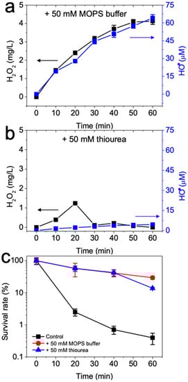 - Ikai, H.; Nakamura, K.; Shirato, M.; Kanno, T.; Iwasawa, A.; Sasaki, K.; Niwano, Y.; Kohno, M. Photolysis of hydrogen peroxide, an effective disinfection system via hydroxyl radical formation. Antimicrob. Agents Chemother. 2010, 54, 5086–5091. [Google Scholar] [CrossRef] [PubMed]
