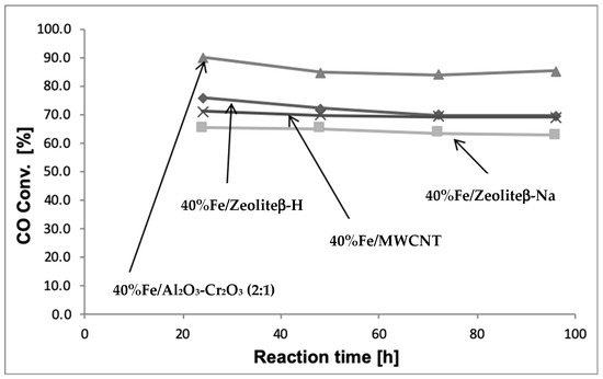 In the case of the iron catalyst supported on MWCNTs, about 7.6% of the CO2 and about 14.3% of the CH4 were observed in the final product. In the case of the iron catalyst supported on Zeolite β-Na, the lowest value of CO conversion and the selectivity towards liquid product was observed at 65.2% and 52.2%, respectively. It is also worth noticing that in the case of this system, the highest selectivity to CH4 (32.6%) and towards CO2 (11%) was detected. The latter suggests that the reaction of methanation and the conversion of carbon monoxide with water vapour ran more efficiently. In addition, the stability tests for the iron catalysts were also carried out in the hydrogenation of the CO process. Figure 1 presents the carbon monoxide conversion values as a function of the reaction time for 40%Fe/Al2O3-Cr2O3 (2:1), 40%Fe/MWCNT and the iron catalysts supported on both types of zeolite BEA. The results clearly showed that all the tested catalysts exhibited stable values during 96 h of the reaction. Only in the case of the 40%Fe/Al2O3-Cr2O3 (2:1) and 40%Fe/Zeolite β-H catalysts, was a slight decrease in CO conversion values observed during the first 48 h of the process [16].