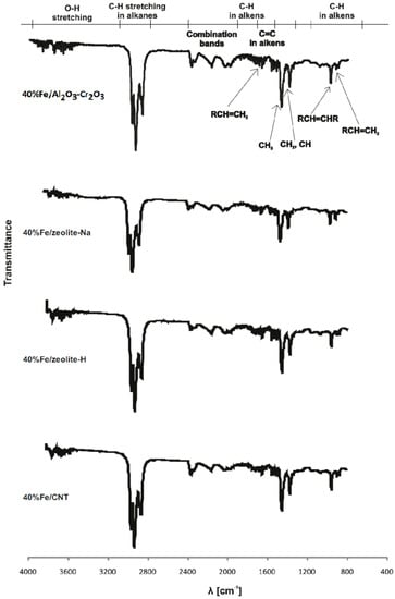 Liquid products formed during the hydrogenation of the CO process were also analysed using GC-MS and FTIR techniques (see Figure 2). The obtained results showed that the saturated, unsaturated and branched hydrocarbons arise within the investigated process on the 40%Fe/Al2O3-Cr2O3 (2:1) catalyst. Table 1 presents the selectivity of the hydrocarbons created during the Fischer-Tropsch reaction. It is worth emphasizing that in the case of the 40%Fe/Al2O3-Cr2O3 (2:1) catalyst, the formation of unsaturated hydrocarbons was detected which were not observed when the process was carried out on the remaining catalysts. In addition, the highest quantity of the linear hydrocarbons formed in the liquid product was observed for the 40%Fe/Zeolite β-H catalyst as evidenced by the highest ratio between the linear and branched hydrocarbons (18.2). The GC-MS analysis of the liquid product obtained during the hydrogenation of CO on the 40%Fe/Zeolite β-H catalyst material gave evidence that it had a high selectivity to linear hydrocarbons. Whereas, the chromatographic analysis performed for the 40%Fe/MWCNT and 40%Fe/Al2O3-Cr2O3 (2:1) catalysts showed the ratio between linear and branched hydrocarbons to be equal to 4.3. In the case of the 40%Fe/Zeolite β-Na catalyst, the formation of lower quantities of linear hydrocarbons was observed. Figure 2 shows the FTIR analysis of the products of the hydrogenation of the CO process performed on the iron catalysts supported on various types of supports. FTIR measurements recorded for the studied Fe catalysts confirmed the presence on their surface of the following functional groups assigned to –OH stretching, –C–H stretching in alkanes, –CH2, –CH, –CH3 and (CH2)n > 4. The presence of the bands attributed to the previously mentioned functional groups confirmed the occurrence of linear and branched hydrocarbons in the final liquid product and the GC-MS results obtained for these catalysts. In addition, the occurrence of the specific bands located on the FTIR spectrum of 40%Fe/Al2O3-Cr2O3 (2:1) assigned to C=C in alkenes, C–H in alkenes, and R–CH=CH–R were confirmed. The presence of the above listed functional groups on the spectra confirmed the chromatographic analysis and the formation of unsaturated compounds formed via the F-T process 2.