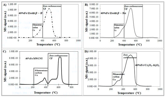 One of the main problems in the hydrogenation of CO is the carbon deposit formed during the process which blocks access to the active centres of the reaction. In order to study the carbon deposit formed in the F-T process, the thermal analysis of the iron catalysts (40%Fe/Zeolite β-H, 40%Fe/Zeolite β-H, 40%Fe/MWCNT and 40%Fe/Al2O3-Cr2O3) after calcination and F-T reaction was done. The obtained TG-DTA-MS measurements are given in Figure 3 and Figure S1–S3, respectively. Figure 3 shows the mass spectrum of the gaseous products formed during the decomposition of all investigated catalysts. The amount and the form of the carbon deposit on the iron catalyst surface (40%Fe/Zeolite β-H and 40%Fe/Zeolite β-Na) are presented in Figure S1 and in Table 2. As it is seen in Figure S1, the carbon deposition is higher for the protonic form of zeolite (36.50%) than for the sodium form of zeolite (31.20%). The oxidation process of carbon occurs in two steps for both iron zeolite catalysts. Both forms of carbon deposits are easily oxidised. The oxidation proceeds up to 600 °C (Figure S1). Two visible peaks of CO2 (MS profile, Figure 3) with a maximum at 370 °C are attributed to the removal of the surface carbides forms (FeC2 and FeC3) and/or filamentous carbon. This type of carbon is probably α carbon, whereas the peak with a maximum at 510 °C may be attributed to the removal of the oligomerized carbon species, which is signed as β carbon (Cβ) or bulks carbides, in line with earlier reports [26,27]. In the case of the iron catalysts supported on the carbon nanotubes material (MWCNTs), we carried out TG-DTA-MS measurements for calcined and used catalysts in order to calculate the quantity of the carbon deposited on the catalyst surface (Figure S2). The TG-DTA measurements showed that iron catalyst Fe/MWCNT used in F-T had a total carbon of 67.22% while for the calcined catalyst, the total carbon which was oxidized to CO2 was 47.11%. These results confirm that the smallest amount of carbon deposit formed after the F-T reaction (20.11) was in the case of the Fe/MWCNT system. These TG-DTA-MS results indicate that this catalytic material should exhibit the highest stability in the investigated process of the hydrogenation of CO. For iron supported on binary oxides catalysts (Figure S3), two peaks of CO2 formation are also observed and this type of carbon is easily oxidised too. Moreover, the amount of carbon deposition is much lower than those of previously investigated catalysts and is equal to 23.45% (Table 2 and Figure S3). In all studied cases, the type of carbon deposition with a maximum at 310 °C is assigned to the removal of surface carbides forms and/or filamentous carbon (Cα), while the second peak with a maximum located at 520 °C can be assigned to the oxidation of iron carbides (Cβ) [26]. It is worth noting that the main type of carbon deposition is β carbon.