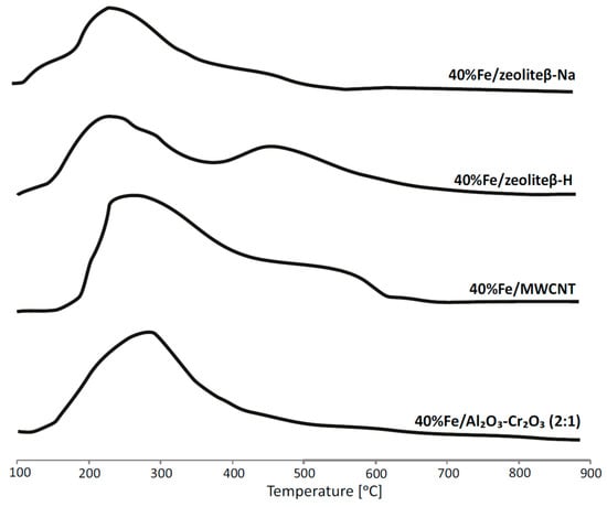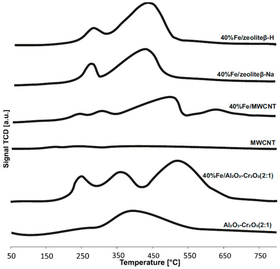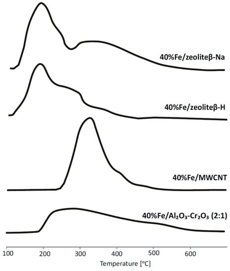 The TPR-H2 curves recorded for the 40%Fe/MWCNT system showed four reduction steps with the maxima of the peaks at 250, 300, 500 and 640 °C, respectively. The first reduction peak located on the TPR profile (240–260 °C) is assigned to the reduction of the surface species of Fe2O3 to Fe3O4. The second effect with the maximum situated at about 300 °C is connected with the partial reduction of Fe3O4 (Fe(II, III)) to the wustite phase (FeO–Fe(II)) [33,34,35] together with the reduction of Fe2O3 strongly interacting with MWCNTs. The third TPR-H2 effect situated at a higher temperature of about 500 °C is connected with the reduction of the magnetite and wustite phases to metallic iron. The last reduction stage visible on the TPR curve above 550 °C is related to the methanation process of the MWCNTs. The TPR-H2 profile of 40%Fe/Al2O3-Cr2O3 (2:1) presents three reduction steps with maxima at about 250, 350 and 550 °C. The first reduction stage is connected with the reduction of Fe2O3 to Fe3O4. The second reduction stage is attributed to the reduction of the Cr(VI) species and Fe3O4 to wustite [2]. The last reduction step presents the reduction of the wustite phase to metallic iron. The TPR-H2 profiles of zeolite-based catalysts present two reduction stages independently on the support form. The observed reduction stages are connected with the reduction of Fe2O3 to Fe3O4. The second peak was attributed to the reduction of magnetite to Fe0 [33,34,35].
