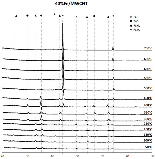 The X-ray diffraction patterns of the Fe/multi-walled carbon nanotube (MWCNT) catalyst collected during the reduction process carried out at a temperature range of 50–700 °C using a reducing mixture of 5% H2-95% Ar.