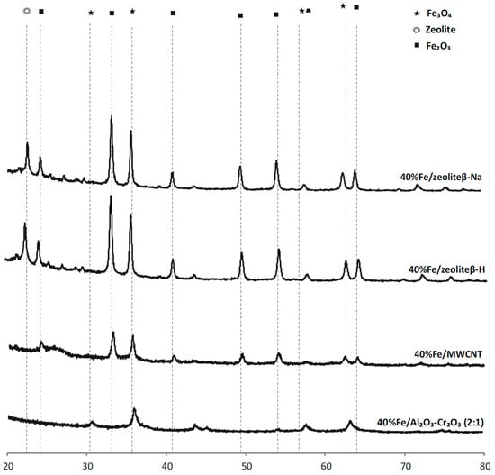 The X-ray diffraction patterns recorded for the spent iron catalysts supported on binary oxide, MWCNTs, zeolite β-H -Na and zeolite β-H.