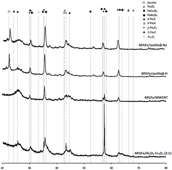 The analysis of the X-ray diffraction studies of the iron catalysts after calcination and after the reaction were studied and the results are presented in Figure 6 and Figure 7. The X-ray analysis of the calcined samples is presented in Figure 6. The diffraction curves recorded for the calcined 40% Fe/MWCNT, 40%Fe/Zeolite β-Na and 40%Fe/Zeolite β-H catalysts confirmed the presence of the hematite and magnetite phases. Moreover, the XRD diffraction curve of the calcined 40% Fe/Al2O3-Cr2O3 (2:1) catalyst showed diffraction peaks assigned to magnetite, FeCr2O4, FeAl2O4 phases, respectively. The X-ray diffractograms recorded for the spent Fe catalysts supported on MWCNTs, Al2O3-Cr2O3 (2:1), zeolite β-H -Na and zeolite β-H are given in Figure 7. The obtained XRD results showed the occurrence of the η-Fe2C, o-Fe3C, h-Fe3C, χ-Fe5C2 and magnetite phases on the diffraction patterns recorded for iron catalysts. XRD analysis performed for the spent catalysts did not confirm the presence of the hematite phase on the surface of the catalysts. In addition, depending on the catalyst composition, the FeCr2O3 and FeAl2O4 phases were also detected on the diffraction curves recorded for the investigated spent catalysts. It is also worth noting that the previously mentioned phases of carbides were not observed on the XRD curves recorded for the calcined catalysts. These results confirm that iron carbides are the active species of the F-T process and are created during the activation process performed in a mixture of CO and H2 (50%CO and 50% H2). Furthermore, the quantity of the carbides determines the catalytic activity in the investigated process. The activity tests performed in the F-T process clearly indicate that iron carbides such as η-Fe2C, h-Fe3C, χ-Fe5C2 which were created on the surface of the catalyst, are the active species in the hydrogenation of the CO reaction [38,39].