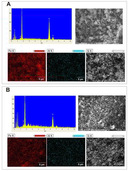 The morphology of the prepared iron-based catalysts supported on Al2O3-Cr2O3 (2:1), zeolite β-H, and zeolite β-Na was investigated in order to elucidate the reasons for the differences in the activity of monometallic Fe catalysts in the F-T process. Both monometallic catalysts supported on the two types of zeolite were investigated. The investigated catalysts were calcined in an air atmosphere for 4 h and the results are presented in Figure 10. The performed SEM-EDS analysis of the surfaces of the catalyst confirmed the presence of Al, Si, O and Fe elements on their surface. The SEM-EDS analysis of the iron catalyst supported on zeolite β–Na confirmed the lack of sodium on the catalyst surface. This result can be explained by the detection limits of SEM-EDS technique. The only observed differences in the tested surfaces were the contents of the individual elements present on the catalyst surface. In the case of the catalyst deposited on the sodium form of BEA zeolite, larger amounts of Fe were observed, which was confirmed by the XRD method. The 40%Fe/Al2O3-Cr2O3 (2:1) catalyst was also studied by this technique [2].