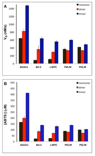 Bcl-2: In comparison to AS1411, Bcl-2 is a relatively low activity DNAzyme [11,24]. As shown in Figure 2B, multimerisation had a remarkable rate-enhancing effect on Bcl-2 activity. The initial rate measurements (monomer, 83 nM/s; dimer, 360 nM/s; trimer, 634 nM/s) showed a 4-fold enhancement effect from dimerisation and nearly 8-fold from trimerisation (Figure 3A). Similar trends were observed in the total amount of ABTS• product formed (Figure 3B).