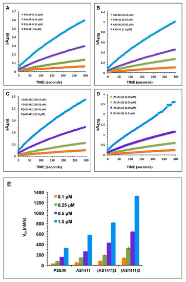 Effect of DNAzyme concentrations on activities of AS1411 multimers and PS5.M. (A) PS5.M; (B) AS1411 monomer; (C) AS1411 dimer; (D) AS1411 trimer. In (A–D), the curves show time courses of ABTS oxidation by 0.1, 0.25, 0.5, and 1.0 μM DNAzyme. (E) Initial Rates (expressed as Vo, nM/s) were calculated from the slope of the initial linear portion of the curves shown in (A–D).