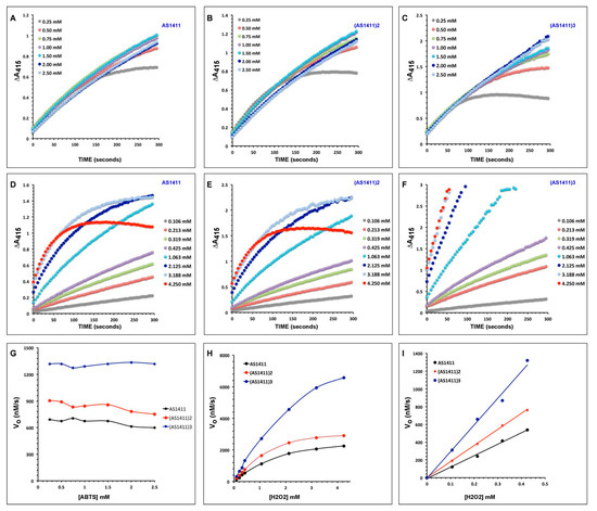In contrast to the effect of ABTS concentration, results shown in Figure 5D,E indicate that the initial rates of the three DNAzymes are dependent on the concentration of H2O2. Figure 5H shows the dependence of initial rates on H2O2 concentration. The pattern indicates a linear correlation between H2O2 concentration and initial rates at the lower H2O2 concentration (Figure 5I). The trend changed to what appears at first to be a saturation kinetics at higher H2O2 concentration, especially with AS1411 and (AS1411)2. However, the time course of the reactions at high H2O2 concentrations (over 2 mM) shows an early plateau of activity, an indication of inactivation of the DNAzymes at high oxidant concentration. Suicide inactivation of natural protein peroxidases and G-quadruplex peroxidase DNAzymes at high H2O2 concentration is a well-known phenomenon that limits the use of peroxidases in certain applications [1,6,8]. In addition, high concentration of H2O2 is known to accelerate the disproportionation of ABTS• radical cation [23]. The response of the activities of the DNAzymes to changes in ABTS and H2O2 concentrations observed here has also been reported in a previous study where it was shown that DNAzymes behave differently from HRP, a natural protein peroxidase [23].