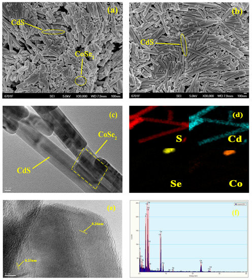 SEM and TEM pattern of sample: (a) SEM pattern of CoSe2/CdS; (b) SEM pattern of pure CdS; (c) TEM pattern of 30% CoSe2/CdS; (d) element mapping of CoSe2/CdS; (e) the HRTEM of CoSe2/CdS sample; and (f) EDX pattern of CoSe2/CdS.