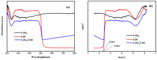 To investigate the UV–VIS absorption properties of the CoSe2/CdS photocatalyst, the UV–VIS DRS was tested and the consequence of pure CdS and CoSe2/CdS is shown in Figure 3. It could be distinctively speculated from Figure 3a that the pure CdS nanorod embraced the absorption edge of around 525 nm. When pure CoSe2 darkened, it absorbed the most light. After the introduction of CoSe2, the CoSe2/CdS composite requires a more sufficient degree of light-absorption capability. In addition, as CoSe2/CdS was doped with the CoSe2 particles, the absorption edge of CoSe2/CdS was slightly enhanced from 525 nm to 540 nm. The absorption intensity could be more obviously observed in the comparatively long wavelength. According to the Kubelka–Munk formula, the phenomenon occurred owing to the decrease of the band gap after the introduction of CoSe2 particles, which showed the composite would be more prone to absorb the solar energy under same wavelength than pure CdS. The phenomenon explains the evolution of hydrogen to some extent. Additionally, we can use the Kubelka–Munk function (Figure 3b) to obtain the band gap energy of CdS, CoSe2, and CoSe2/CdS, respectively. With the introduction of CoSe2, the band gap of CoSe2/CdS was lower than that of pure CdS, which meant the charge transfer would be easier.