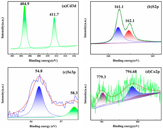For further studying the constituents of the CoSe2/CdS and verifying the elements on the surface, the XPS pattern was employed to present the contents of the catalyst. Figure 4a–d show the XPS spectra of Cd3d, S2p, Co2p, and Se3d, respectively. In Figure 4a, the main peaks of the Cd 3d5/2 and Cd 3d3/2 fell at 404.9 eV and 411.7 eV. Similarly shown in Figure 4b, the main peaks located at 161.1 eV and 162.1 eV correspond to S 2p3/2 and S 2p1/2 [39]. In the same way, the main peaks in Figure 4c, situated at 54.8 eV and 58.3 eV, correspond to Se 3d5/2 and Se 3d3/2 [40]. Finally, Figure 4d suggests that the two main peaks located at 794.68 eV and 779.3 eV, correspond to Co 2p3/2 and Co 2p1/2 [41]. The above characteristic peaks were all assigned to their corresponding elements. The result verified the existence of the pertinent elements. Therefore, the XPS specifically certified the existence of the CoSe2/CdS photocatalyst.