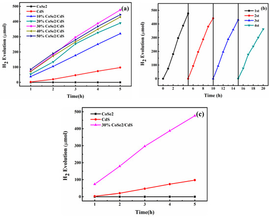 To study the photocatalytic property of the CoSe2/CdS system, the CoSe2/CdS system was adopted with different ratios ranging from 10% to 50% to explore the hydrogen evolution activity under continuous visible light irradiation. The single CoSe2 and CdS experiments were arranged to verify the relatively feeble hydrogen activity compared to the CoSe2 doped with CdS photocatalyst. As presented in Figure 5a, the CoSe2 could rarely produce H2 in a way, which indicated pure CoSe2 might not qualify as a semiconductor. Compared with pure CoSe2, pure CdS had a fairly high efficiency of hydrogen evolution at 10,000 μmol/g. After doping with CoSe2, the hydrogen evolution activity surged apparently. Although CoSe2 did not present any semiconductor property, it actually could be a co-catalyst with in cooperation with CdS nanorods. The introduction of CoSe2 particles would supply an exit for photogenerated electrons to accelerate the transition efficiency and present the phenomenon in the form of hydrogen evolution. Ranging from 10% to 50%, the increase of CoSe2 could enhance the hydrogen evolution quantity and culminate at a ratio of 30% (50,000 μmol/g). Afterwards, along with the increase of CoSe2, the hydrogen evolution activity declined instead. This sign indicated that the increase of CoSe2 might not merely increase the visible light absorption but also hamper the CdS nanorod from absorbing visible light. Thus, the hydrogen evolution quality reduced great deal.