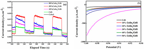 For the sake of studying the mechanism during the charge transfer process of the catalysts, the photoelectrochemical attribute was confirmed in a 0.2 M Na2SO4 electrolyte environment. Figure 6a shows the current intensity-time curves of different catalysts in a condition under intermittent visible light illumination. With the light on and off, an evident photocurrent response presented in IT curves. The result could account for the sign of hydrogen evolution. As obviously shown in Figure 6a, pure CoSe2 did not present any photocurrent response. Comparatively, pure CdS showed a relatively high current response. The above result verified the assumption made before. Gradually, along with the enhancement of CoSe2 content, the photocurrent response apparently grew. Especially, the 30% CoSe2/CdS catalyst exhibited the supreme photocurrent density in a parallel condition. It can be held that the minor CoSe2 particles could not support enough predators for electrons, but redundant CoSe2 particles increased the burden during the electron transfer process. Ideally, this might be a process in which the separation and recombination between electrons and holes would be somehow improved.