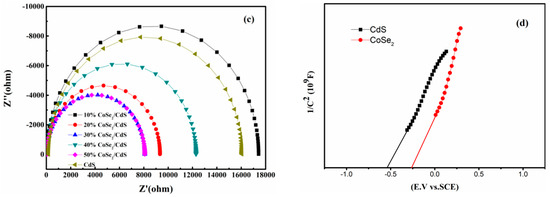 The Mott–Schottky curve of the CdS and CoSe2 is shown in Figure 6d. Both CdS and CoSe2 exhibited positive slope, which showed that the CdS and CoSe2 were both n-type semiconductor. By means of investigating the linear part of the curve, we can acquire the flat band potentials of CdS and CoSe2 via the intersection consisting of the linear partial tangent and horizontal axis. According to previous literature, the conduction band position (ECB) of n-type semiconductors is more negative, about −0.1 V or −0.2 V, than its Efb. Meanwhile, we replace the conduction band and valence band position of the saturated calomel electrode (SCE) with the conduction band and valence band position of the normal hydrogen electrode (NHE) by Equation (1):