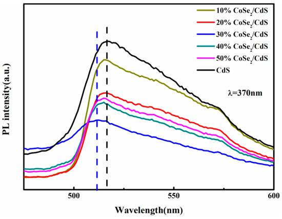 In order to make CoSe2 have a special function in photogenic charge separation, we employed different catalysts to seek for regularity. As seen in Figure 7, the CdS was stimulated by 370 nm light so as to generate strong light fluorescence, and the maximum peak fell in the 520 nm that stimulated the catalyst from the steady-state to the first excited state along with the separation of electron-hole pairs. Nevertheless, the electrons were excited before becoming unstable. By means of the radiation transition process the electrons would decay to the ground state. In addition, energy would emit in the form of photons that produced fluorescence. Once the CoSe2 was introduced to the system, PL emission exhibited a relatively intense quench phenomenon, which declared that the recombination between electrons and holes was alleviated. In particular, along with the increase of CoSe2 content, notable quenching phenomenon would arise. Especially, the quenching phenomenon would culminate when the CoSe2 content was adjusted to 30%, which was consistent with photocatalytic H2 evolution. In this reaction process, the phenomenon would be explained as follows: CoSe2 loaded on the CdS surface produced a synergistic effect and provided a swift electron transfer pathway so as to retard recombination and enhance the separation relationship between electrons and holes. Namely, the recombination of electron-hole pairs was retarded, which led to the consequence of lower fluorescence intensity. Moreover, adding CoSe2 led to a slight blue shift rise in the curve, which was attributed to the quantum confinement effect. According to the Bohr radius, when the size of quantum particles closed to the exciton Bohr radius, the size reduction would restrict the movement of the current carrier, which led to the increase of kinetic energy. The originally continuous band structure would evolve to a quasi-discrete energy level, and the effective band gap of quantum dots increased with the growth of the kinetic energy. As a result, the corresponding fluorescence spectra and absorption spectra appeared to blue shift.