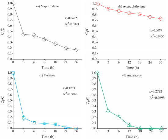 where Ct is the concentration of bound PAH residues at a specific oxidation time. The pseudo-first-order kinetics fitting figure of bound PAH residues degradation was listed in Figure S1. To determine the degradation rate of individual PAHs during the Fenton oxidation period, the pseudo-first-order kinetic reaction rate constant (k, h−1) was used to characterize the reactivity. From Figure 2, the preferred oxidation reaction (ANT > FLU > NAP > ACP) was observed in the citric-Fenton reaction. In bound PAH residues, the kinetic reaction rate constants of ANT were 2.17, 6.45 and 34.46 fold higher than that of FLU, NAP and ACP, respectively.