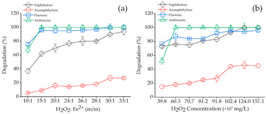 Experiment on the effect of different factors on Fenton oxidation, the oxidation processes were conducted with different factors (H2O2: Fe2+ (m/m), H2O2 concentration, pH, solid: liquid (g/mL) and acid kind). Test conditions are shown in Table 4 (Sets 2–Sets 6). 3 g of soil was poured into a glass reaction bottle. The volume of ferric sulfate and hydrogen peroxide are listed in Tables S2 and S3, respectively. The test operation was carried out as described above, and the bottles were incubated with shaker incubator under 160 rpm, 25 °C for 24 h. The reaction ended by adjusting the pH. Triplicate samples from each were taken at t = 0, 24 h for analysis of concentrations of bound PAH residues in contaminated soils as described in Section 4.2.