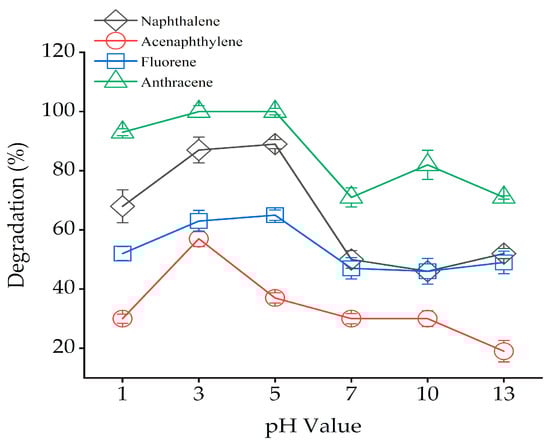 The effect of pH (1–13) on bound PAH residues degradation was studied, and results were obtained, as shown in Figure 4. The findings revealed that pH significantly influenced the degradation of bound PAH residues. The maximum degradation of bound PAH residues (NAP, FLU and ANT) was observed at pH 5, but the optimal pH for bound ACP residues degradation was 3. For example, when pH was 3, the removal rates of four bound PAH residues were 87%, 57%, 63%, and 100%, while their degradation rates were 89%, 37%, 65% and 100% at pH 5. In the control treatments, bound PAH residues were hardly degraded at initial different pH values without Fenton reagent, as shown in Figure S3. In the pH ranges of both 3 and 5, the removal rates of four bound PAH residues were all relatively high, while the degradation rates were decreased under extremely acidic, neutral, and alkaline conditions.