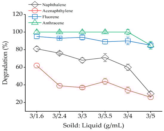 Effect solid: liquid (g/mL) on bound PAH residues oxidation with Fenton reagent. Solid = 3 g, H2O2: Fe2+ = 30:1 (m/m), H2O2 (102.4 × 103 mg/L), pH = 3. Error bars represent standard errors.
