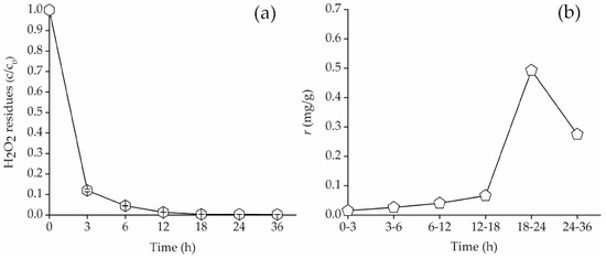 The residual concentration of H2O2 over time was analyzed to determine the decomposition rate. Figure 6a showed the evolution of bound PAH residues oxidation over time in soil, i.e., k = 0.16 h−1 (R2 = 0.78). The k value was lower than that reported in the previous study [33], this pointed to the absence of oxidizable matter (transition matter, soil organic matter, etc.) in soil.