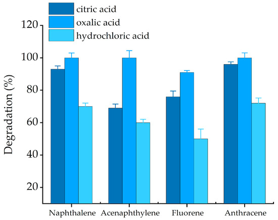 PAHs are rarely degraded through Fenton-like oxidation due to their low bioavailability in soils [34]. In the hydrochloric acid-Fenton system, the addition of K2C2O4 notably enhanced the degradation of bound PAH residues. In Figure 7, the removal rates of four bound PAH residues (NAP, ACP, FLU, and ANT) were 70%, 43%, 50%, and 72%, respectively, under hydrochloric acid condition. Using citric acid, almost 93%, 50%, 76% and 96% of degradation was observed. For the oxalic acid-Fenton system, the degradation of bound PAH residues was least 91%. This result indicated that the degradation of the three acids were significantly different, which can be summarized as follows: oxalic > citric > hydrochloric.