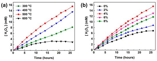 The photocatalytic activity of H2O2 synthesis on Au/SnO2-TiO2 hybrids was tested under UV light and the concentration of H2O2 was quantified by spectrophotometry with copper ions and 2,9-dimethyl-1,10-phenanthroline (DMP) [27]. The standard curve indicates that the absorbance and concentration of H2O2 exhibits a good linear relationship with R square of 0.9996 (Figure S3). Figure 2a shows time courses for the H2O2 generation of photocatalysts obtained at different sintering temperatures. Noticeably, 0.1% Au loaded SnO2-TiO2 obtained at 500 °C exhibits the highest photocatalytic activity compared to that obtained at the other sintering temperatures. In combination with XRD data, when the sintering temperature is 300 °C, the content of SnO2 in the samples is minimal, and the activity is not obviously improved. The photocatalytic activity of the samples obtained at 600 °C is the lowest, possibly because of the formation of a less active rutile phase.