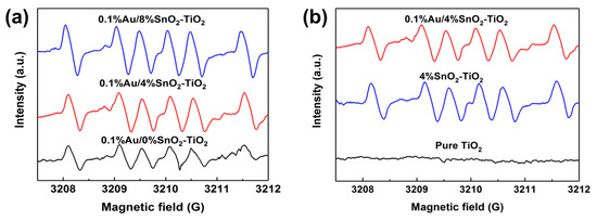 In general, H2O2 from 2e– ORR by CB electrons can be produced through stepwise coupled electron and proton transfers (Equations (1)–(3)) [28,29]. In order to further study the formation mechanism of H2O2, in situ ESR measurements were carried out using DMPO as the trapper of radical species. The radical signals of DMPO-•OOH consisting of six characteristic peaks were detected for all of Au and/or SnO2 modified TiO2, while there is no obvious signals for pure TiO2 (Figure 3a,b), showing that H2O2 formation over Au loaded and/or SnO2 modified TiO2 photocatalysts is indeed a stepwise single electron reduction process, and both Au and SnO2 could promote the formation of HO2• via Equation (2).