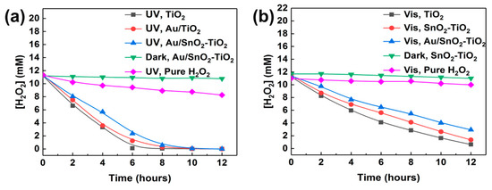 H2O2 photodecomposition under UV light (a) and visible light (b) conditions.