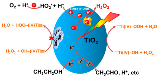 Au is an active cocatalyst and has shown great potential in improving the performance of photocatalytic H2O2 production [15,16]. Tada et al. [15] reported enhancement of the photocatalytic activity of TiO2 in producing H2O2 by Au cocatalyst loading. They also found that the formation of H2O2 was generally accompanied by decomposition. The concentration of H2O2 produced from the photocatalytic reduction of O2 can also be increased by restricting its thermocatalytic decomposition through controlling the temperature and pH of the reaction solution [16]. Indeed, these studies improved H2O2 formation activity by suppressing the decomposition process by controlling the reaction condition. However, there is still no effective means of enhancing the intrinsic activity of photocatalysts for H2O2 production. It is well known that both the structures and band gaps of TiO2 and SnO2 are similar. They all consist of MO6 octahedrons as the structural unit. The conduction band (CB) of SnO2 (0 V vs. SHE) is more positive than that of the TiO2 (−0.3 V vs. SHE) and it is possible to improve charge separation in a photocatalytic reaction when heterojunctions are formed by both oxides [21,22,23]. In this study, we prepared SnO2-modified anatase TiO2 (SnO2-TiO2) heterojunction using the molten salt method [24]. SnO2 passivation suppressed H2O2 complexation and decomposition on the surface of TiO2. Loading of Au nanococatalysts further remarkably enhanced the H2O2 formation rate.