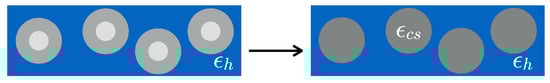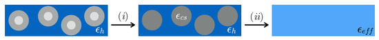 - Using the Transfer Matrix Method [35] taking as inputs the effective dielectric constant of the slab with the core-shell inclusions and its thickness ( nm). The procedure followed is illustrated in Figure 9. (i) The initial system is reduced to one in which the core-shell inclusions are transformed into homogeneous spheres with dielectric function . The dielectric function of these homogeneous spheres () has been calculated following the proposed approach (Equation (9)). () Using Maxwell Garnett, taking as inputs the dielectric function of the host medium (water, ), the effective dielectric function of the inclusions calculated using Equation (9) (), and the filling fraction (), we have calculated the effective medium of the whole system . Finally, using the Transfer Matrix Method (TMM) [35], we have calculated the reflectance of a homogeneous slab with dielectric function and thickness nm at normal incidence.