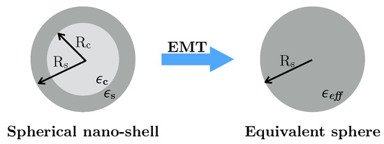 Although the electromagnetic response of spherical core-shell NPs has an analytical solution given by Mie theory [12], it is not trivial to obtain an effective dielectric function of this system. Mie theory for a coated sphere gives exact analytical expressions for the absorption/scattering/extinction efficiencies and scattered electric and magnetic fields. However, it does not provide an expression for the effective dielectric function of a coated sphere. Therefore, effective medium theories (EMTs) give an alternative to deal with this problem. EMTs allow us to obtain the dielectric function of an equivalent sphere with the same size and electromagnetic behavior as a given spherical core-shell NP. This process is illustrated in Figure 2.