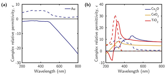 Figure 3 shows the dielectric function () of the chosen materials. The optical constants have been taken from different sources of the literature: Au [30], CuO [31], CeO [32] and TiO [33].