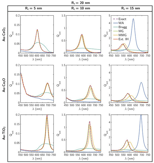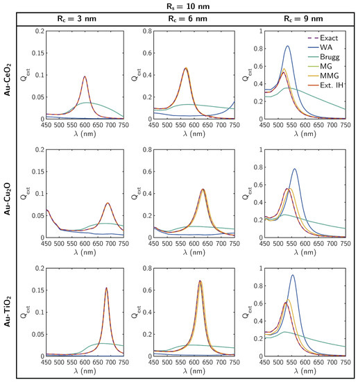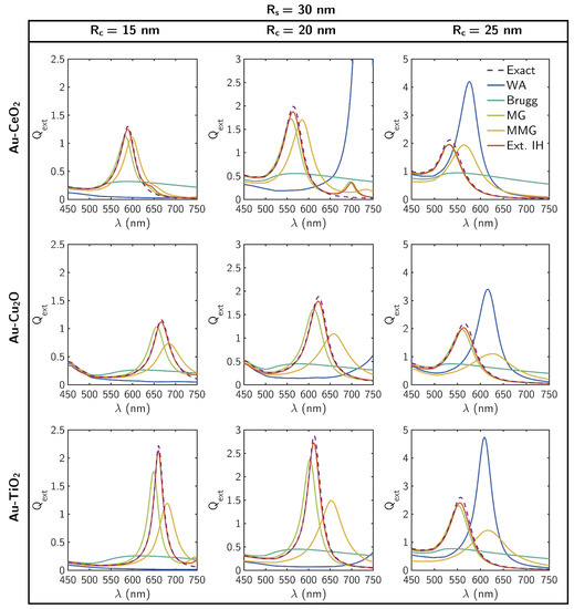 Figure 4, Figure 5 and Figure 6 show the efficiency spectra () of Au-CeO, Au-CuO and Au-TiO core-shell NPs with external radius 10, 20 and 30 nm and varying core radii . These sizes have chosen in order to work in the dipolar regime. The exact spectra calculated with Mie theory for a coated sphere are compared with those obtained by using the effective dielectric functions in Mie theory for a homogeneous sphere. The considered effective dielectric functions have been calculated with the following EMTs: weighted average (WA), Bruggeman (Brugg), Maxwell Garnett (MG) (which leads to the same expression as the IH proposed by Chettiar–Engheta), Mie theory based Maxwell Garnett (MMG) and the proposed approach (Ext. IH).