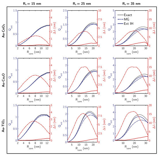 Since MG and Ext. IH EMTs fit the exact solution best, we have performed a more systematic comparison of the performance of both EMTs. For that reason, Figure 7 shows the spectral shift (, red right axis) of the peak predicted through MG and Ext. IH EMTs with respect to the exact solution as a function of the core radius . Indeed, the accurate prediction of the spectral position of the localized surface plasmon resonances is crucial in the design of core-shell nanoparticles for their application in photocatalysis. The precise selection of the resonant wavelength will determine the efficiency in which the catalyst absorbs light and the coupling of the enhanced electromagnetic field with the band gap of the semiconductor shell. Therefore, low values of are desirable. In addition, in Figure 7, the predicted values of the peaks (blue left axis) along with the exact value are plotted. Again, Au-CeO (top row), Au-CuO (middle row) and Au-TiO core-shell NPs (bottom row) are considered. In this case, the total radii of the NPs are nm (left column), nm (middle column) and nm (right column). The calculations have been performed for core sizes ranging in nm.