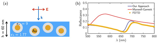 As an example of the applicability of the results in this research, here we will compare the reflectance at normal incidence of a system consisting of a homogeneous slab with metal-semiconductor core-shell inclusions calculated using different methods. The slab (i.e., host medium) has been considered to have a thickness of nm and a dielectric function (water). The core-shell inclusions have an Au core of radius = 10 nm, and the shell has a thickness of 10 nm and dielectric function (TiO). The filling fraction of inclusions in the slab is . A scheme of this system is sketched in Figure 8a. Note that there is not an analytical solution to calculate the reflectance of these types of systems.