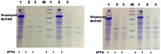 Protease accessibility analyses of the surface-displayed cells. (A,B) BL21(DE3) cells and BL21 (DE3) pLysS cells carrying a pET22b-pelblpad vector. (C,D) BL21(DE3) cells and BL21 (DE3) pLysS cells carrying a pET22b-gdsllpad vector, respectively. M: protein marker, Lane 1–3: the outer membrane fractions from no proteinase K treated cells, with 0.05 mg/mL proteinase K treated cells, and with 0.1 mg/mL proteinase K treated cells, respectively. PrK: proteinase K; IPTG: isopropyl β-D-thiogalactoside.