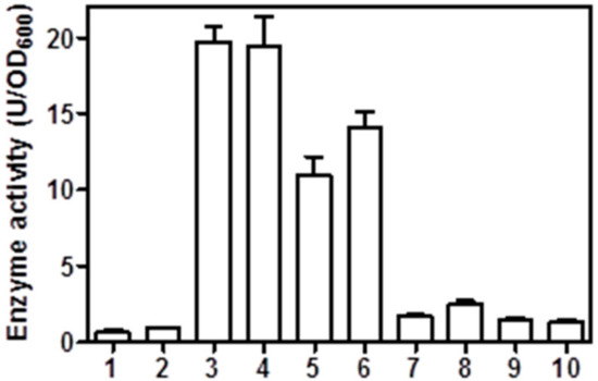 Phenolic acid decarboxylase activity of the surface-displayed cells. 1 and 2: BL21(DE3) and BL21(DE3)pLysS3 cells carrying a blank pET-22b vector, respectively; 3 and 4: BL21(DE3) and BL21(DE3) pLysS cells carrying a pET22b-pelblpad vector, respectively; 5 and 6: BL21(DE3) and BL21(DE3) pLysS cells carrying a pET22b-gdslblpad vector; 7 and 8: proteinase K treated BL21(DE3) and BL21(DE3) pLysS cells carrying a pET22b-pelblpad vector, respectively; and 9 and 10: proteinase K treated BL21(DE3) and BL21(DE3) pLysS cells carrying a pET22b-gdslblpad vector, respectively. Catalytic activity was measured under standard assay conditions.
