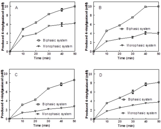 Bioconversion of ferulic acid (FA) in monophasic and biphasic systems with four different surface-displayed cells. (A,B) BL21(DE3) cells and BL21 (DE3) pLysS cells carrying a pET22b-pelblpad vector, respectively. (C,D) BL21(DE3) cells and BL21 (DE3) pLysS cells carrying a pET22b-gdsllpad vector, respectively.
